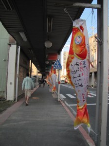 町中に応援のメッセージが書いてある鯉のぼりが飾られていた